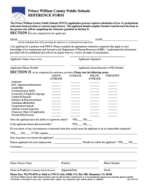 The pwcs reference form is a document used by the Prince William County Schools (PWCS) to gather essential information about an applicant's qualifications and experiences. This form is typically required during the hiring process and serves as a tool for verifying an applicant's background through references. It is designed to ensure that the hiring committee has a comprehensive understanding of the candidate's skills, work ethic, and suitability for the position. The form includes sections for personal information, reference details, and specific questions that help assess the applicant's capabilities.