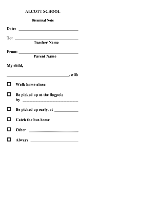 A sample early dismissal note from parent is a formal document that informs the school about a child's early departure. This note typically includes the student's name, the reason for early dismissal, and a parent's signature. Having a clear and concise sample early dismissal note from parent can help streamline communication with the school.
