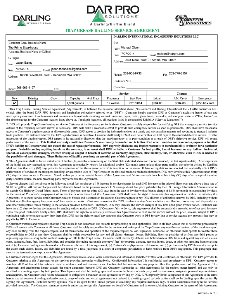 Trap Grease Hauling Service Agreement Clean Form