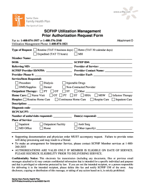 The SCFHP authorization form is a crucial document used by healthcare providers to obtain approval for specific medical services or treatments from the Santa Clara Family Health Plan (SCFHP). This form ensures that the requested services are medically necessary and covered under the plan. It is essential for providers to submit this form to facilitate timely access to necessary healthcare for patients while adhering to insurance guidelines.