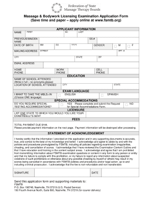 The legal use of the Fsmtb Mblex application is governed by various regulations and standards that ensure its validity. To be considered legally binding, the application must be filled out truthfully and submitted in accordance with the FSMTB guidelines. It is essential to understand that providing false information can lead to severe penalties, including denial of licensure. Additionally, the application must comply with relevant state laws regarding massage therapy practice, ensuring that applicants are aware of their rights and responsibilities.