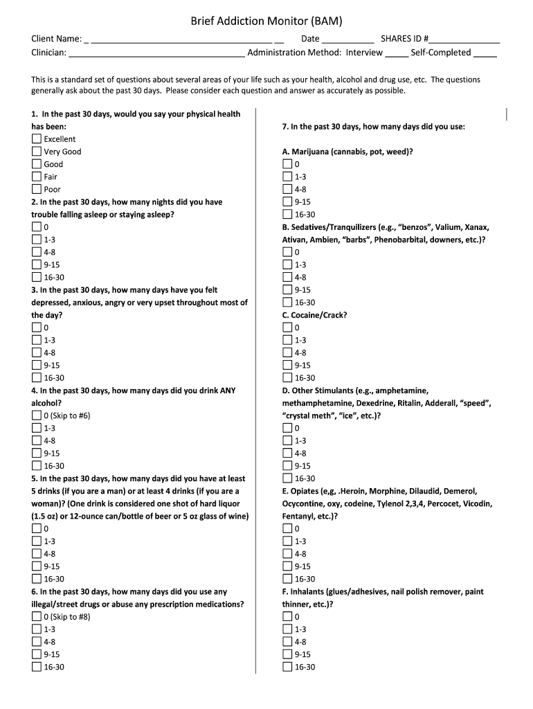 The Brief Addiction Monitor (BAM) is a standardized assessment tool used to evaluate an individual's substance use and related behaviors. Developed by Concord Counseling Services, the BAM aims to identify patterns of addiction and provide insights into the severity of substance use disorders. This assessment is particularly useful in clinical settings for guiding treatment decisions and monitoring progress over time.