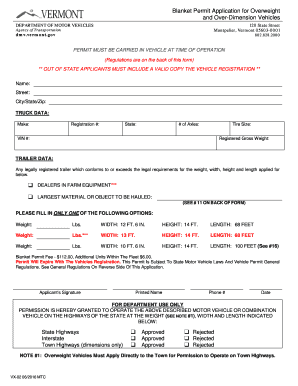 To obtain a Vermont overweight permit, applicants must submit a completed application to the Vermont Agency of Transportation. The application typically requires details about the vehicle, including its weight, dimensions, and the intended route. Applicants can access the necessary forms online, ensuring a streamlined process. It is crucial to provide accurate information to avoid delays in processing.