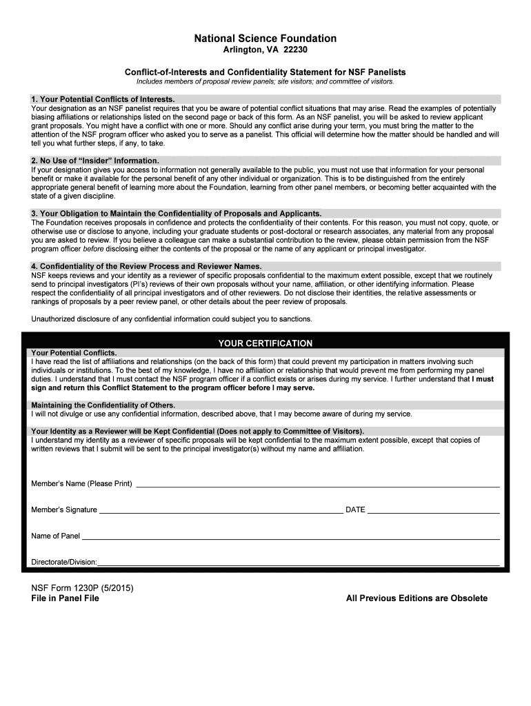 Understanding the Conflicts of Interests and Confidentiality Statement for NSF Panelists NSF Form 1230P