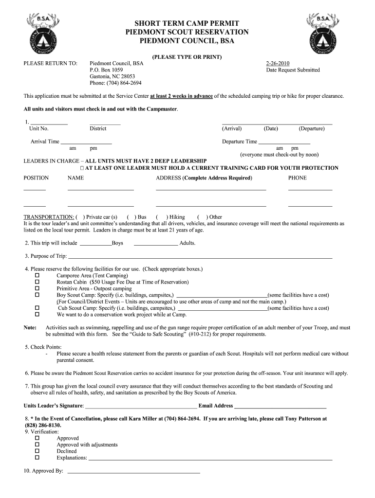 The Short Tem Camp Permit Bairventuringbborgb is a specific document required by the BSA Piedmont Council for conducting short-term camping activities. This permit ensures that all necessary safety and regulatory measures are in place, allowing participants to engage in outdoor experiences while adhering to established guidelines. It is crucial for leaders and organizers to understand the requirements associated with this permit to ensure a successful camping event.