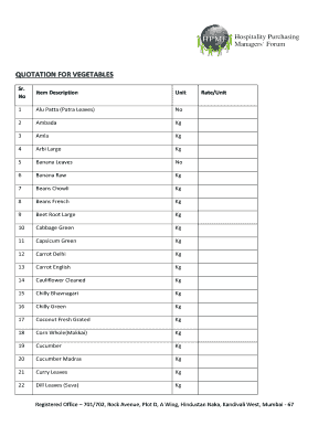 A vegetable quotation format is a structured template used by businesses to provide cost estimates for vegetable pricing. This format helps ensure clarity and accuracy in pricing, making it easier for both sellers and buyers to understand the costs involved.