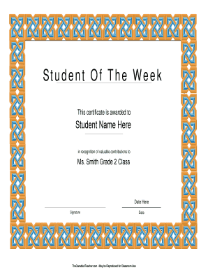 A student of the week certificate is a recognition award given to students for their outstanding achievements or behavior. It serves as a motivational tool to encourage students to excel in their academic and personal endeavors. With airSlate SignNow, you can easily create and customize these certificates for your classroom.