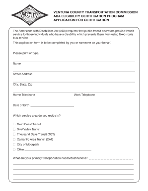 To apply for the Ventura County Transportation Commission Ada Eligibility Certification Goventura, you must complete an application form available on the VCTC website. After submitting the necessary documentation, your application will be reviewed, and you will receive a notification regarding your eligibility status.