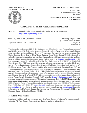 The Afi 36 2115 is an official document used within the United States Air Force. It serves as a critical form for personnel management, detailing various administrative processes. This form is essential for maintaining accurate records and ensuring compliance with Air Force regulations. It is specifically designed to facilitate the management of personnel actions and is part of the broader framework of Air Force Instructions (AFIs).