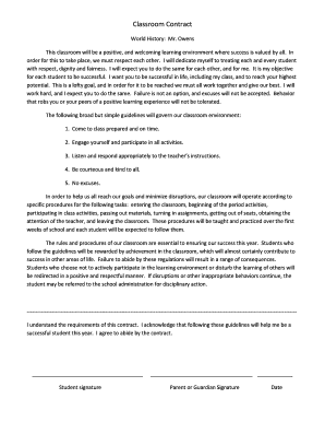 Completing the classroom contract PDF involves a few essential steps. Begin by customizing the template to fit your classroom's unique needs. Next, hold a discussion with your students about the rules and expectations included in the contract. After addressing any questions or concerns, have each student sign the document, along with the teacher. Finally, distribute copies to all parties involved, ensuring that everyone retains a copy for reference throughout the academic year.