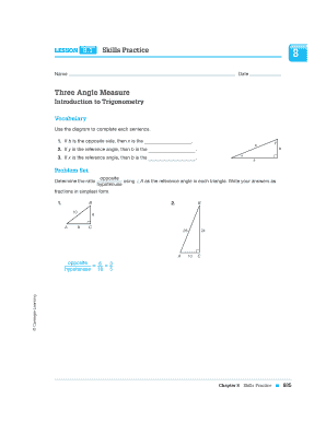 Say goodbye to lost or misplaced files, time-consuming form navigation, and errors that require reprinting new document copies. airSlate SignNow meets your document management needs in just a few clicks from any device of your choice. Modify and eSign lesson 9 1 skills practice three angle measure introduction to trigonometry answers to ensure clear communication throughout your form preparation process with airSlate SignNow.