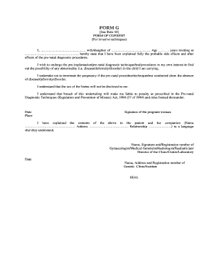 The FORM G, also referred to as the pcpndt form g, is a crucial document that serves as a consent form for invasive techniques. It is specifically designed to ensure that individuals are fully informed about the procedures they are consenting to. This form is particularly relevant in medical and legal contexts where informed consent is mandatory. The details outlined in the form include the nature of the invasive techniques, potential risks, and the rights of the individual providing consent. Understanding the implications of this form is essential for both patients and healthcare providers to ensure compliance with legal standards.