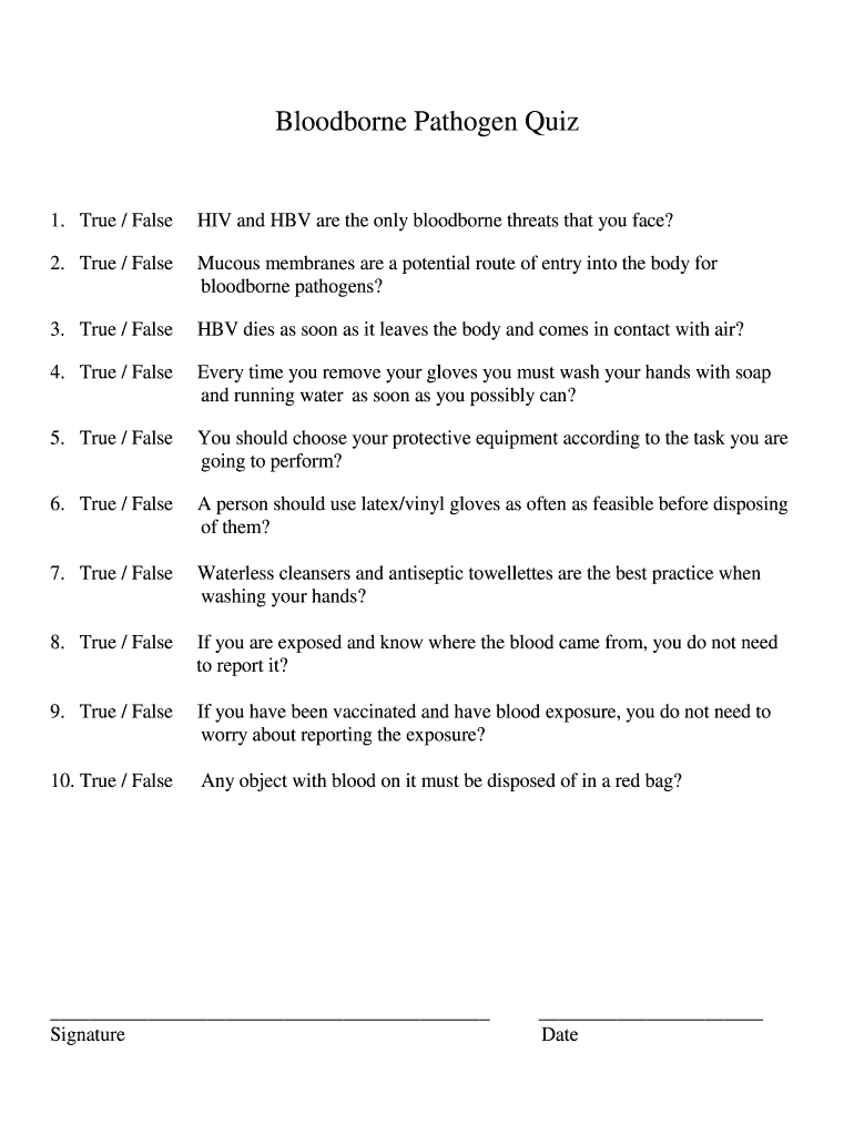 Bloodborne Pathogens Quiz Answers Form