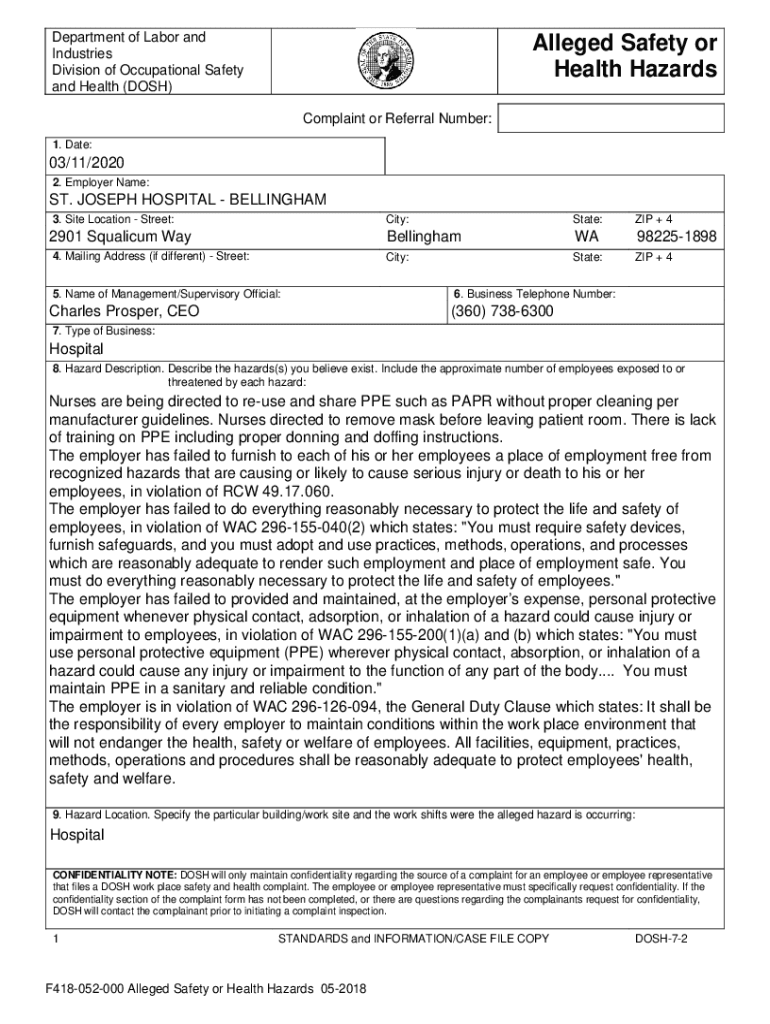 Safety Complaints Washington State Department of Labor Form