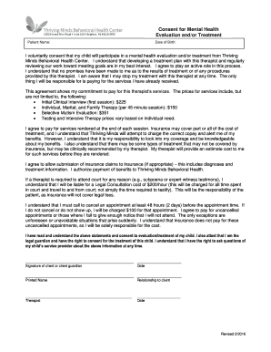 The 'Consent For Mental Health Evaluation Andor Treatment Patient Name Date Of Birth I Voluntarily Consent That My Child Will Participate In A Mental Health Evaluation Andor Treatment From Thriving Minds Behavioral Health Center' form is essential for obtaining permission from parents or guardians. It ensures that your child can receive necessary mental health services while complying with legal requirements.