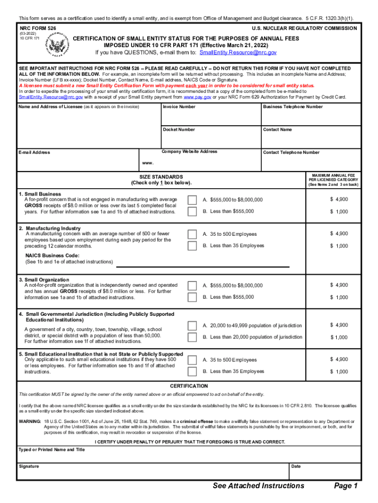 Using the NRC Form 526 involves several key steps. First, determine if your business qualifies as a small entity based on the criteria established by the NRC. Next, gather the necessary information required to complete the form, including details about your business size and operations. Once the form is filled out accurately, it can be submitted to the NRC for review. Utilizing electronic signature solutions can streamline this process, ensuring that your submission is both efficient and compliant with legal standards.