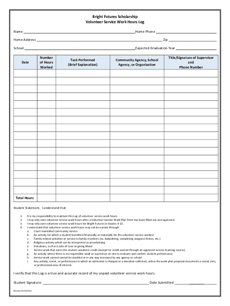 The Bright Futures Volunteer Service Work Hours Log is legally recognized as a valid document for scholarship applications, provided it is completed accurately. To ensure its legal standing, it must include authentic signatures and reflect true volunteer hours. The use of this log complies with Florida state regulations regarding scholarship eligibility and community service documentation. It is important for students to keep copies of their logs for personal records and future reference.