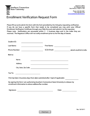 The Enrollment Verification Request Form Southernct is a crucial document used by students to request verification of their enrollment status at Southern Connecticut State University. This form is typically required for various purposes, including financial aid applications, insurance verification, and employment opportunities. By providing official proof of enrollment, the form helps facilitate access to essential services and benefits that depend on a student's current status.