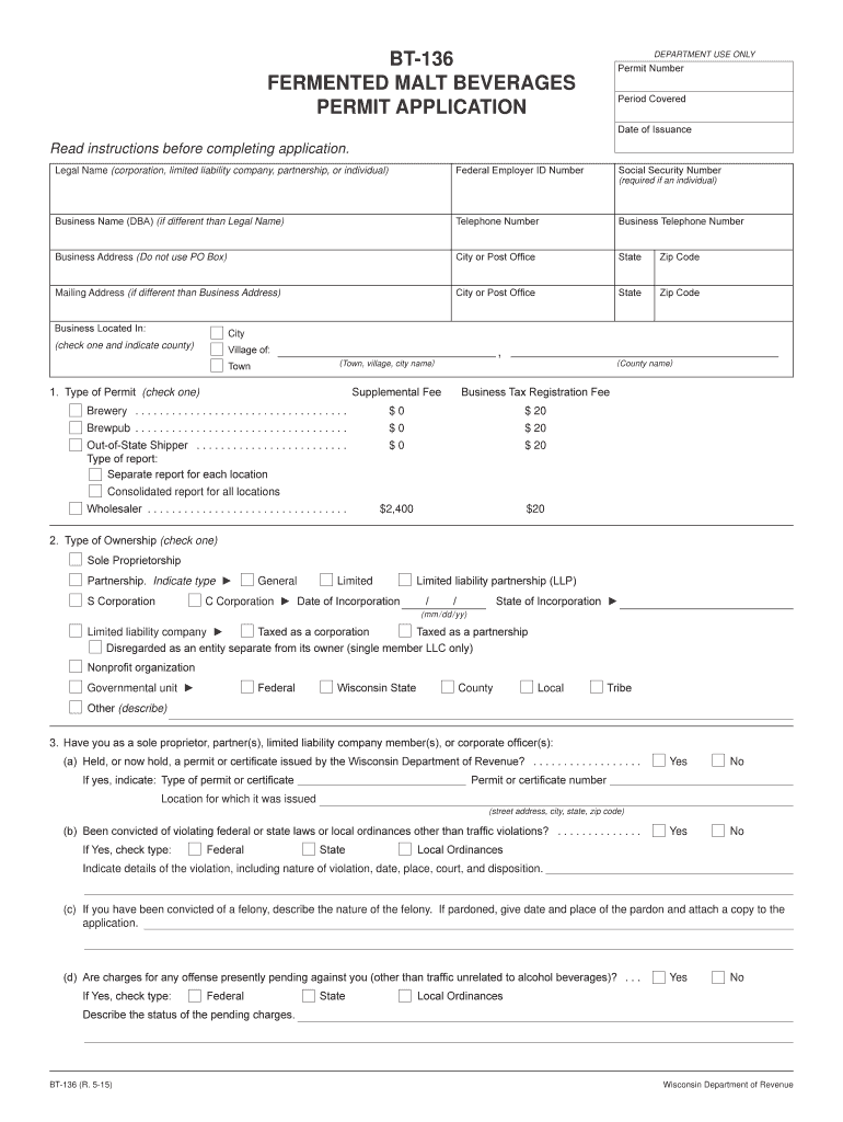 Find and fill out the correct may 2015 bt 136 fermented malt beverages permit application revenue wi