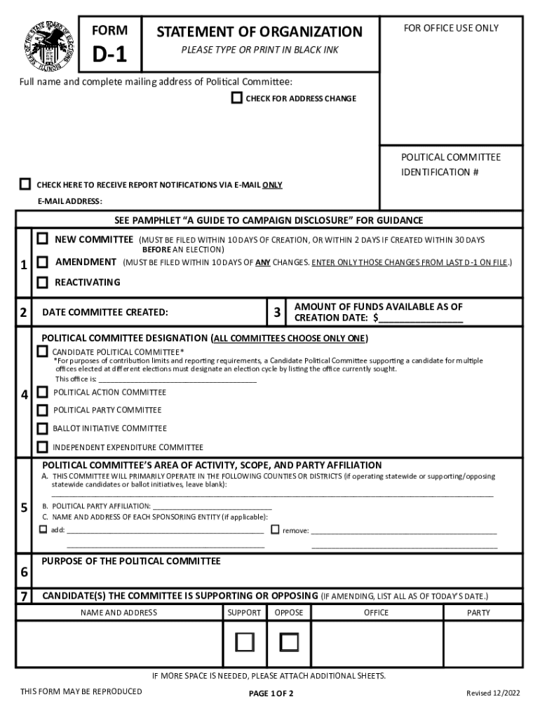 The D-1 Statement of Organization is a crucial document used in Illinois for the registration of political committees. This form is essential for any organization that intends to engage in political activities, including fundraising, campaigning, or supporting candidates. By filing the D-1, organizations officially declare their intent to operate within the political landscape of Illinois, ensuring compliance with state election laws. This form helps maintain transparency and accountability in political financing.