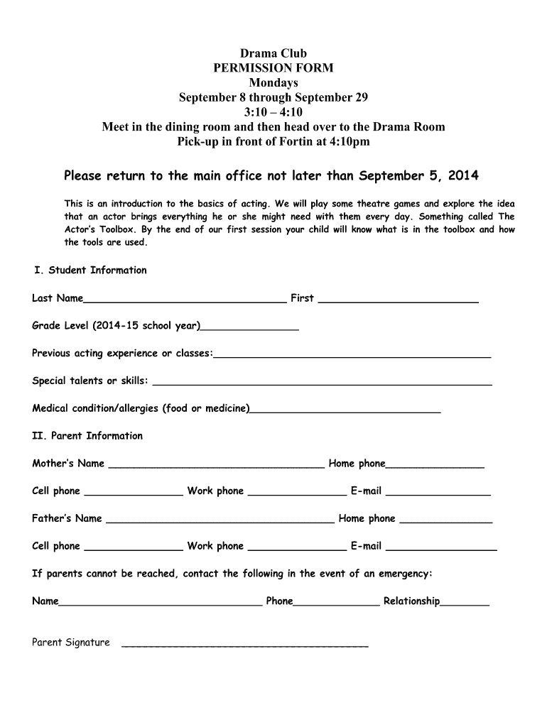 Get more for Drama Club PERMISSION FORM Mondays September 8 Through