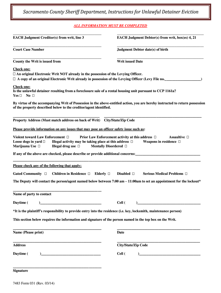 Using the 7483 031 form involves several key steps. First, landlords must fill out the form with accurate details about the tenant and the reasons for eviction. It is crucial to include specific information such as the rental agreement terms and the violation that led to the eviction notice. Once completed, the form must be served to the tenant in accordance with California law, ensuring that they receive proper notification. Landlords should keep a copy of the form for their records, as it may be needed in court proceedings.