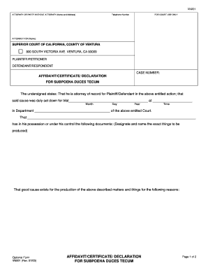 AffidavitCertificateDeclaration for Subpoena Duces Tecum Ventura Courts Ca Form