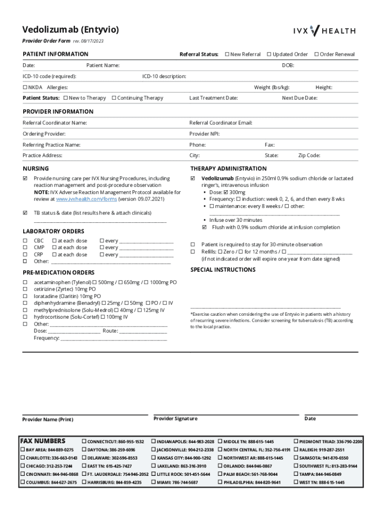 The Entyvio Vedolizumab Order Form ARJ Infusion Services is a streamlined document designed to facilitate the ordering process for Entyvio, a medication used to treat certain autoimmune conditions. This form ensures that healthcare providers can efficiently manage patient orders while adhering to necessary protocols.