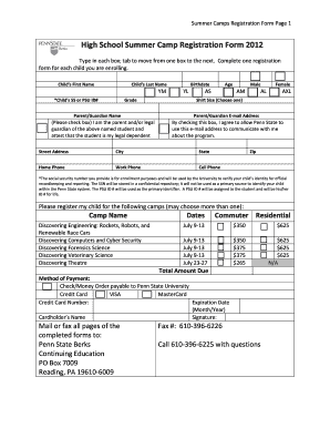 Using the High School Summer Camp Registration Form involves several straightforward steps. First, obtain the form from the designated source, typically the Penn State summer camp website or office. Next, fill out the required fields accurately, providing personal information, medical history, and any special accommodations needed. Review the completed form for accuracy before submitting it. Finally, follow the submission instructions provided, which may include online submission, mailing, or delivering the form in person to the appropriate office.