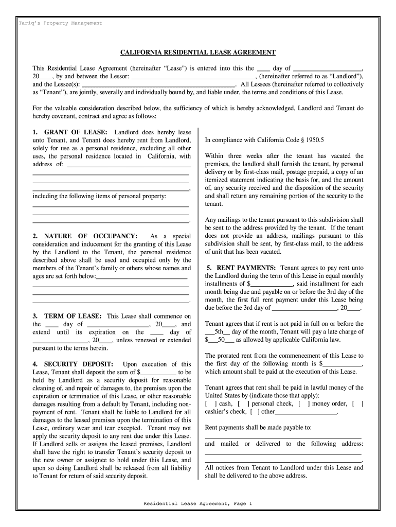Legal Use of the California Residential Lease Agreement 1 Grant of Lease
