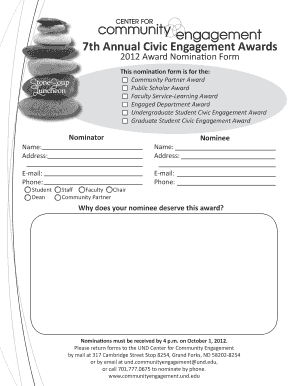 The legal use of the 7th Annual Civic Engagement Awards involves adhering to the guidelines set forth by the organizing body. This includes ensuring that all nominations are made in good faith and that the information provided is accurate and truthful. Participants must respect the intellectual property rights associated with any materials used in the nomination process and comply with local regulations regarding awards and recognitions.