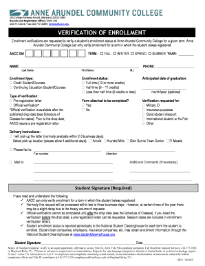 Enrollment verifications are essential documents that confirm a student's enrollment status at Anne Arundel Community College for a specific term. These verifications serve various purposes, including providing proof of enrollment for financial aid, insurance, and employment. They typically include details such as the student's name, program of study, enrollment dates, and status (full-time or part-time).