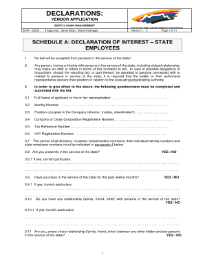 What is the DECLARATIONS VENDOR APPLICATION SUPPLY CHAIN MANAGEMENT SCM 555 B Approved Danie Steyn Branch Manager Version 1 Page 1 Of 11 SCHEDULE A DECLARATION OF INTEREST STATE EMPLOYEES 1 Capetown Gov.?