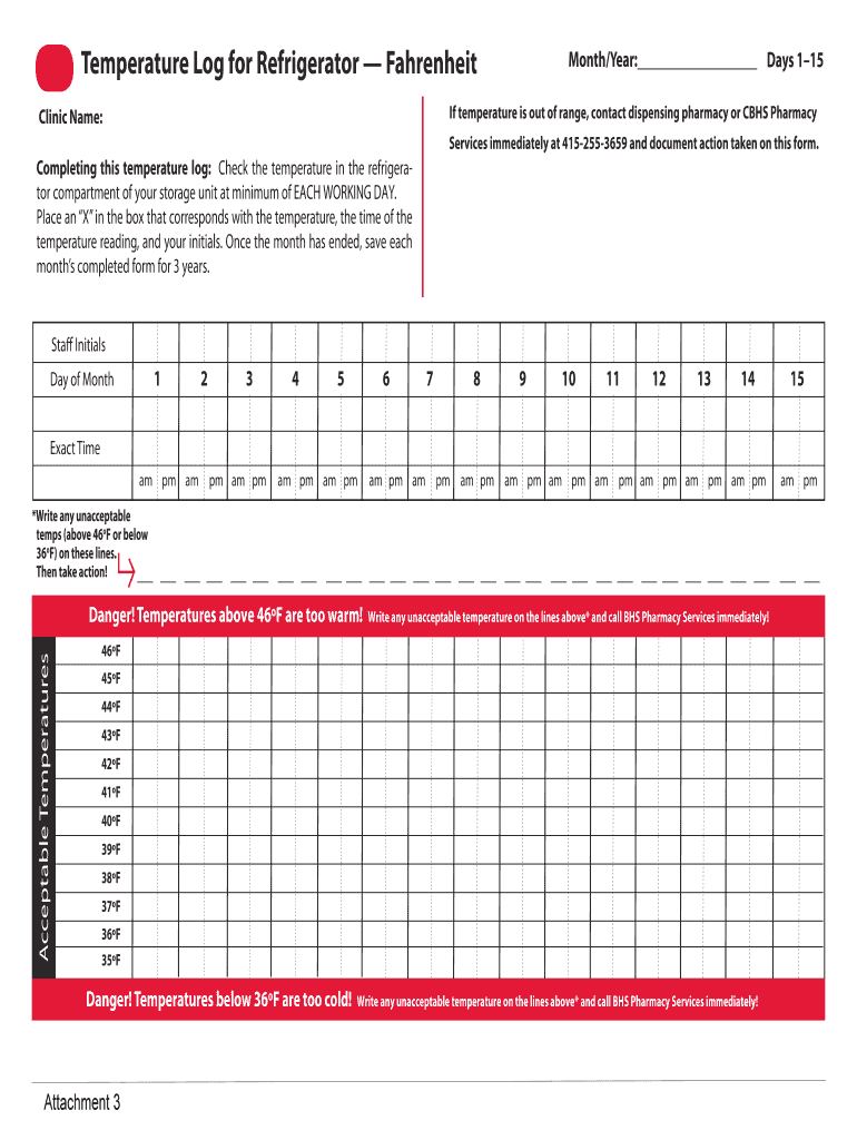Temperature Log for Refrigerator Fahrenheit Sfdph Form