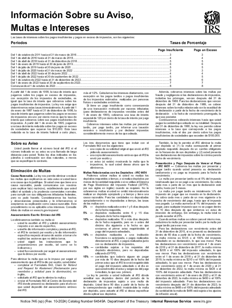 Notice 746, also known as "Información sobre su aviso, penalidad e intereses," is a crucial document issued by the IRS. This notice provides taxpayers with important details regarding any penalties and interest that may apply to their accounts. The Spanish version ensures accessibility for Spanish-speaking individuals, offering clarity on their tax obligations. It outlines the reasons for the notice, the specific penalties incurred, and how interest is calculated on unpaid taxes.