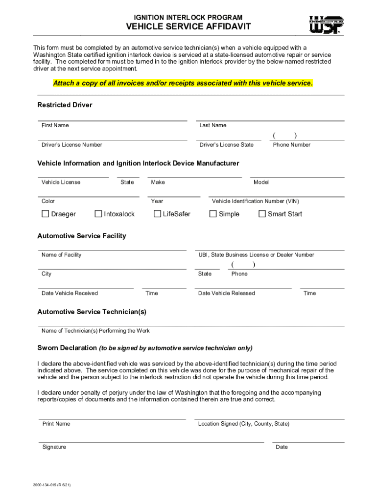 To obtain the Ignition Interlock Program Vehicle Service Affidavit R 621, individuals must typically contact the Washington State Patrol Impaired Driving Section. This affidavit serves as proof of compliance with the program's requirements and is necessary for maintaining driving privileges during the program.