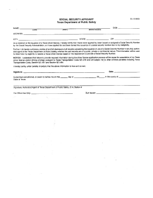 The Form DL 13 is a specific affidavit used in Texas for individuals who do not possess a Social Security Number (SSN). This form is crucial for various legal and administrative purposes, particularly when applying for a Texas driver's license or identification card. The affidavit serves as a declaration of the individual's status regarding their SSN, which may be required by the Texas Department of Public Safety (DPS) to verify identity and eligibility for state-issued documents.