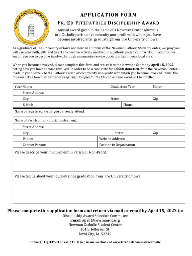 Find and fill out the correct fillable online application form fr ed fitzpatrick d award fax email