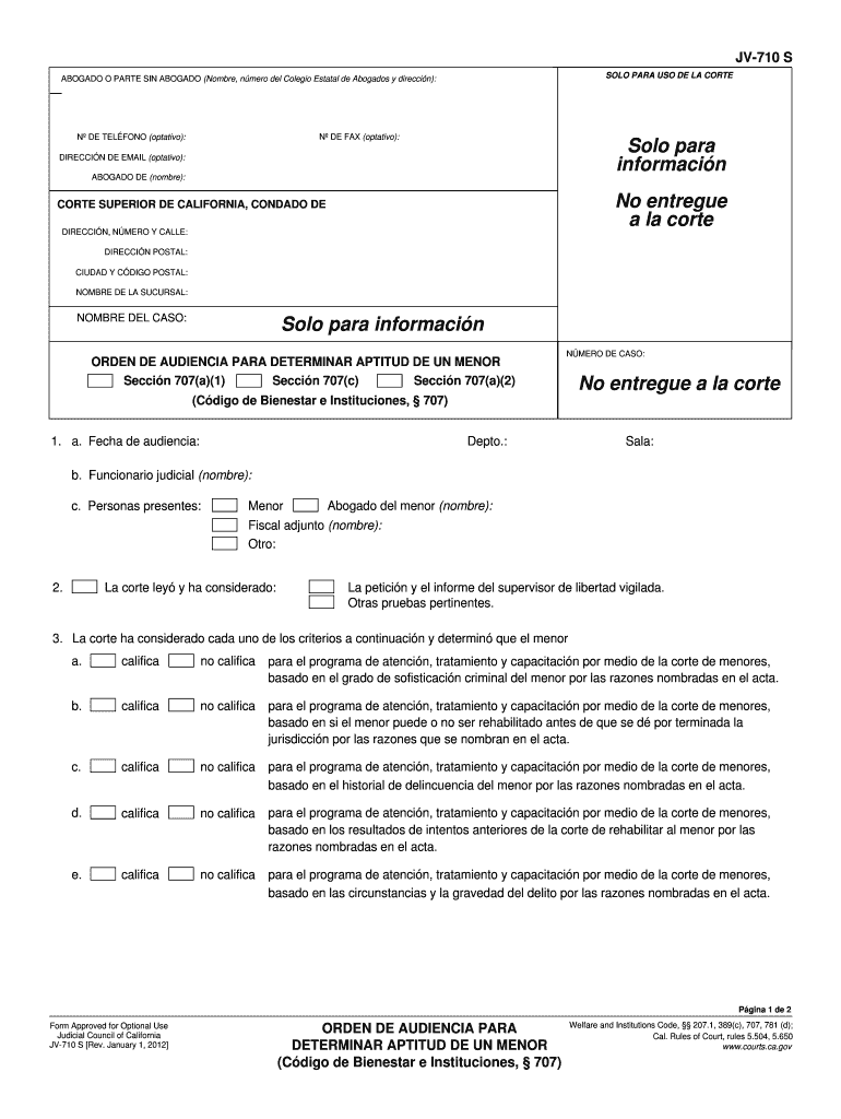 Find and fill out the correct jv 710s juvenile fitness hearing order welfare california courts courts ca