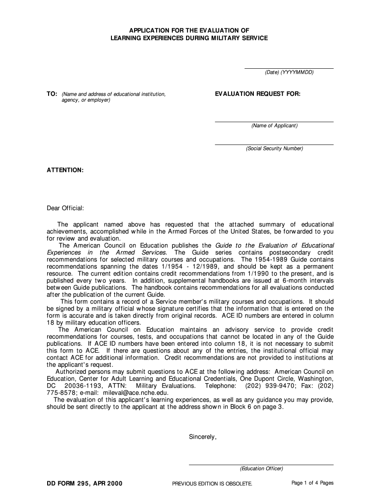 The DD Form 295, also known as the Application for the Evaluation of Foreign Educational Credentials, is a critical document used by military personnel and veterans seeking to have their foreign education assessed for equivalency in the United States. This form is essential for those who wish to further their education or pursue employment opportunities that require verification of their educational background. It serves to facilitate the recognition of foreign academic credentials by U.S. institutions and employers.