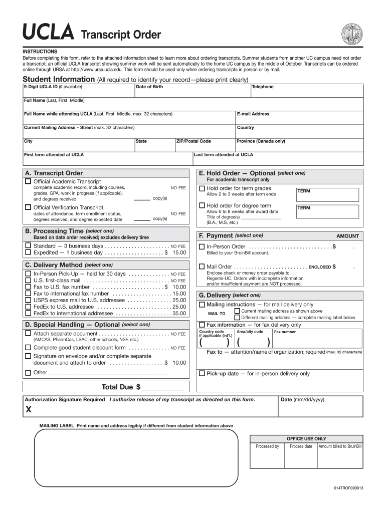 The UCLA Transcript Order Form is legally binding when completed correctly, especially when it comes to the signatures and stipulations involved. To ensure the form is legally recognized, it is crucial to follow all instructions provided by the university. This includes using a secure method for submission and ensuring that all personal information is accurate. Compliance with relevant laws, such as the Family Educational Rights and Privacy Act (FERPA), is also essential to protect the privacy of the educational records being requested.