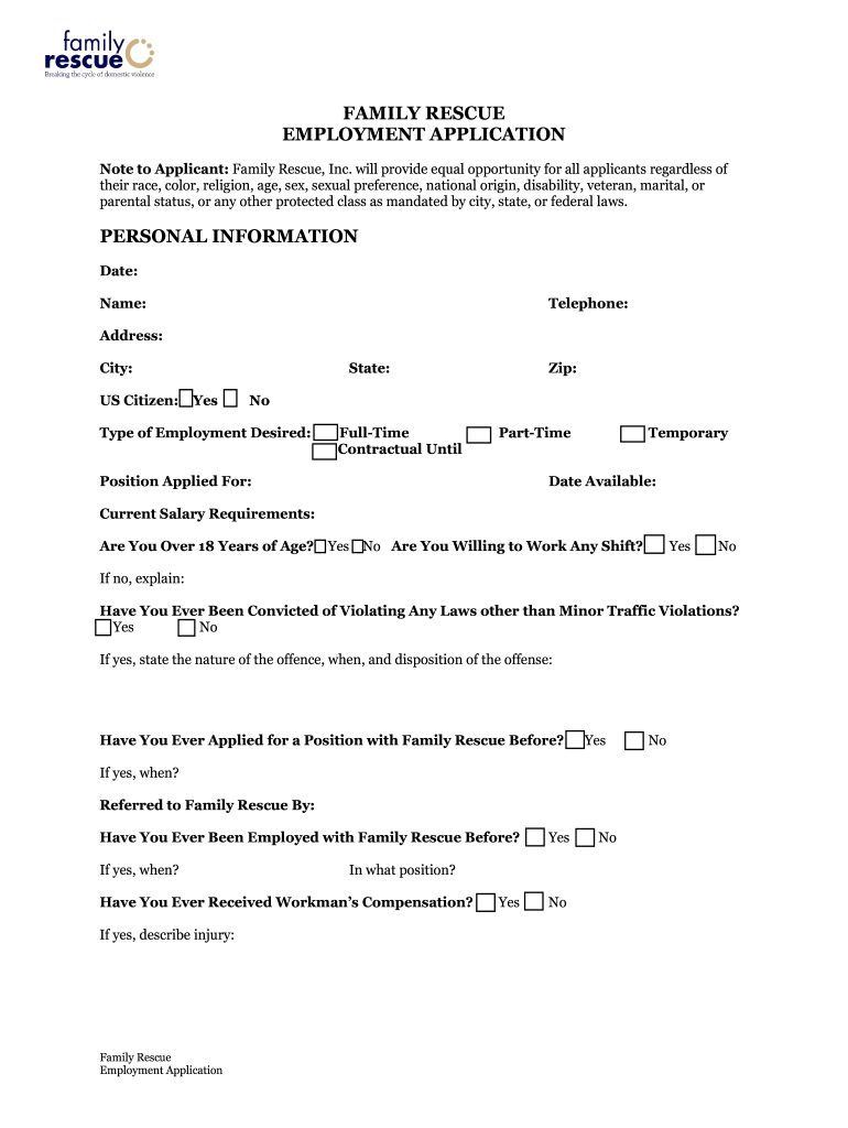 FAMILY RESCUE EMPLOYMENT APPLICATION Form