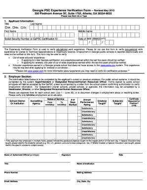 The Georgia PSC Experience Verification Form is a crucial document used by individuals seeking to verify their professional experience in fields regulated by the Georgia Professional Standards Commission (PSC). This form is essential for educators and other professionals who need to demonstrate their qualifications and work history as part of their licensure or certification process. The form collects detailed information about the individual’s employment history, including job titles, responsibilities, and the duration of employment, ensuring that all submitted information is accurate and comprehensive.