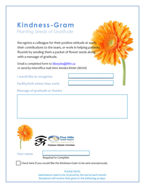 The kindness gram is a thoughtful way to express appreciation and positivity towards others. It serves as a template for sending messages of kindness, gratitude, or encouragement. This form can be customized to fit various occasions, making it a versatile tool for personal connections. Whether used in a workplace setting or among friends, kindness grams aim to foster goodwill and strengthen relationships.