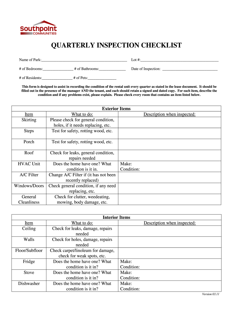 A quarterly inspection checklist is a tool designed to help businesses systematically assess their operations every three months. It allows organizations to ensure compliance, identify areas for improvement, and document findings effectively. Using a quarterly inspection checklist helps streamline the review process and enhance accountability.