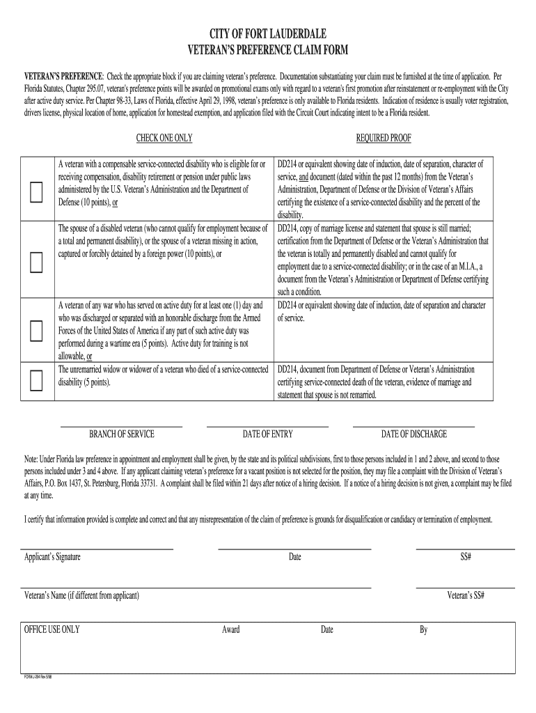 The Form J 204 is a document used to establish veterans' preference in employment within the City of Fort Lauderdale. This form is essential for veterans seeking to gain an advantage in hiring processes, ensuring that those who have served in the military receive fair consideration. The form outlines the eligibility criteria and necessary documentation required to claim this preference.