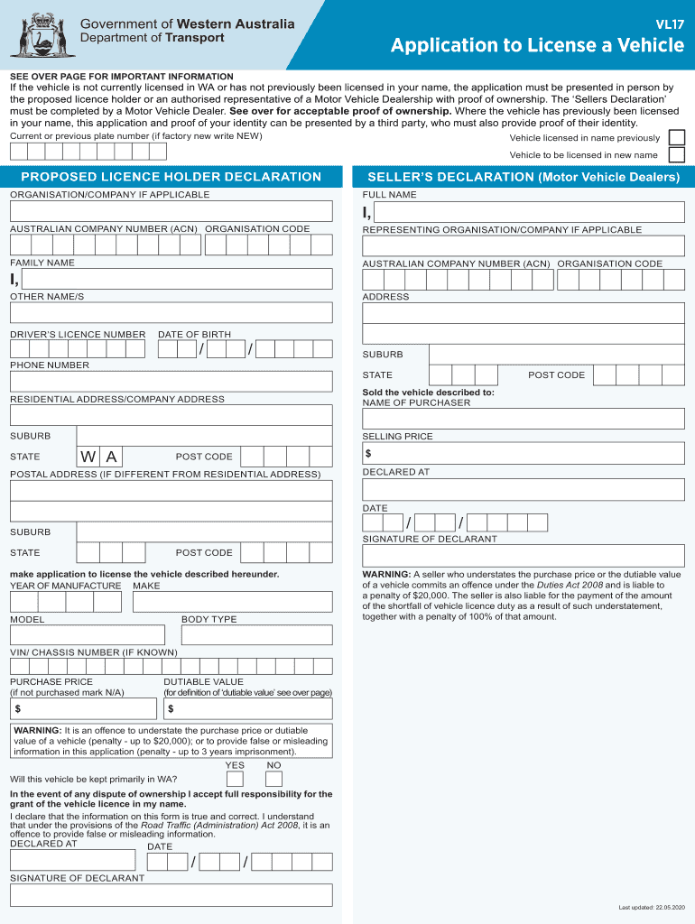 The vl17 form, known as the Application to License a Vehicle, is a crucial document required by the Department of Transport in the United States. This form is essential for individuals seeking to register their vehicles officially. It serves as a formal request to obtain a vehicle license, ensuring that all necessary information is provided to comply with state regulations. The vl17 form collects vital details such as the vehicle's identification number (VIN), make, model, and the owner's information, which are necessary for processing the application.