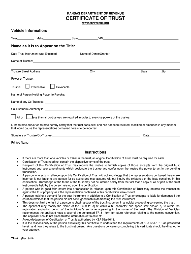 The Kansas Certificate of Trust Form, often referred to as the TR-81, is a legal document that certifies the existence of a trust in the state of Kansas. This form provides essential details about the trust, such as the name of the trust, the identity of the trustee, and the powers granted to the trustee. It serves as proof of the trust's validity and is often required when dealing with financial institutions, real estate transactions, or other legal matters involving the trust's assets.