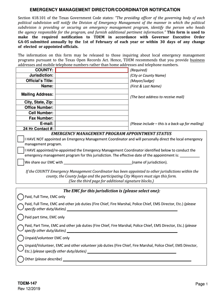 The TDEM 147 form can be obtained through the Texas Division of Emergency Management's official website or by contacting their office directly. It is essential for emergency management directors and coordinators to have access to the most current version of the form to ensure compliance with state regulations. Regular updates and training on how to access and complete the form can enhance operational efficiency during emergency situations.