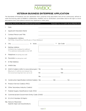 Completing the VBE application involves several key steps to ensure accuracy and compliance. Begin by gathering necessary documentation, which typically includes proof of veteran status, business ownership details, and financial records. Next, fill out the application form carefully, ensuring that all information is accurate and complete. After submitting the application, be prepared to provide additional documentation if requested. Finally, monitor the status of your application and respond promptly to any inquiries from the NWBOC to facilitate a smooth approval process.